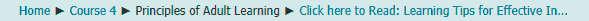 - Breadcrumbs:use the breadcrumb links located under the site name, on the top - left of the screen to view your current location and move back to previous pages by click on the appropriate link. In this example clicking on 'Course 4' will take you to the main page of course 4.